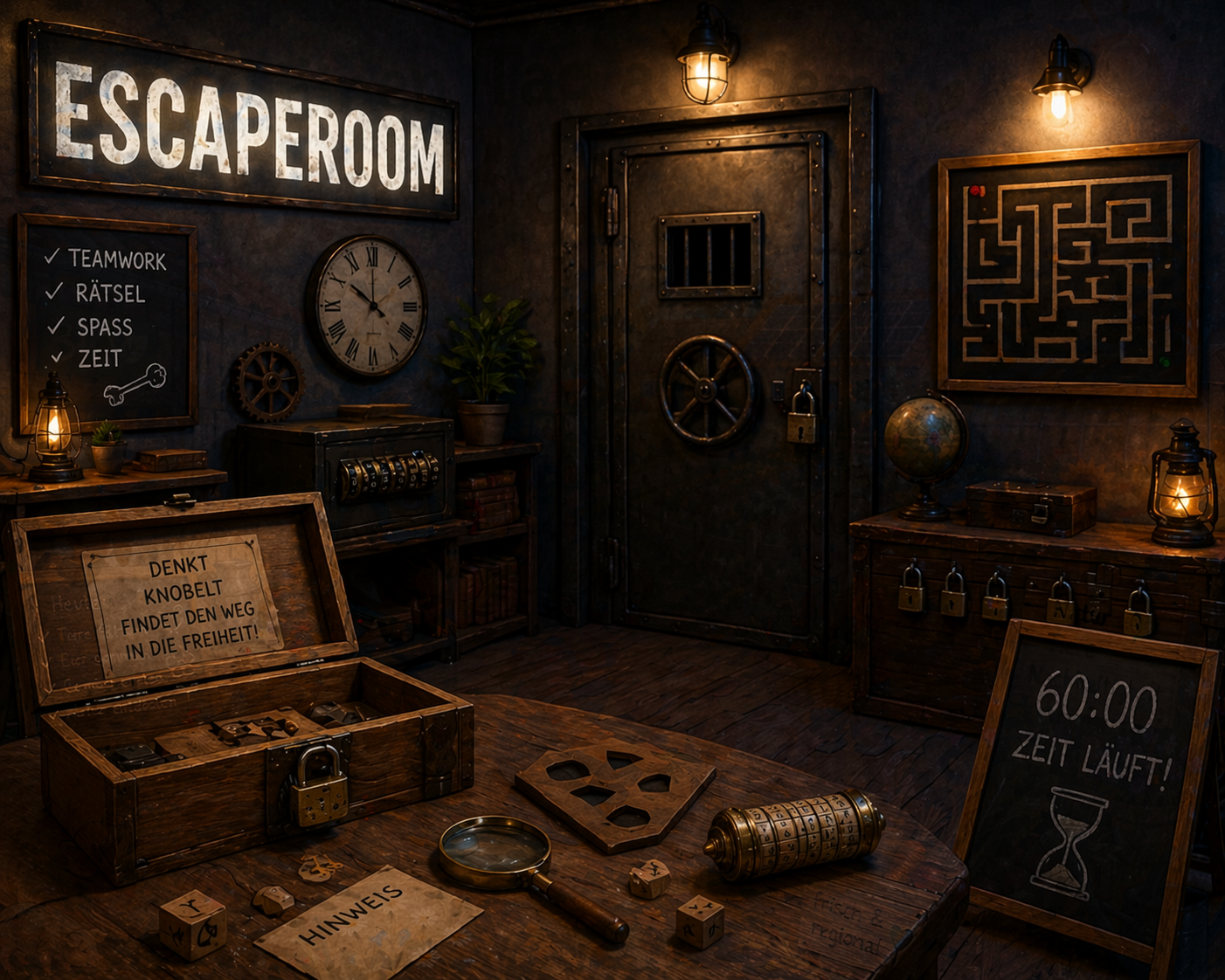 Willkommen zu einem spannenden Abenteuer voller Rätsel, Geheimnisse und Überraschungen! In diesem Escape Room seid ihr ein Team und müsst gemeinsam Hinweise suchen, knifflige Aufgaben lösen und versteckte Codes knacken. Die Zeit läuft – nur wenn ihr gut zusammenarbeitet, könnt ihr alle Rätsel rechtzeitig lösen und den Ausgang finden. Seid aufmerksam, denkt kreativ und habt vor allem Spaß. Seid ihr bereit für die Herausforderung? Dann beginnt das Abenteuer jetzt!